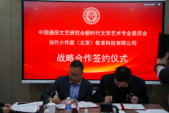会议期间,中国通俗文艺研究会新时代文学艺术专业委员会与当代小作家(北京)教育科技有限公司签订战略合作协议。双方将携手推动文学艺术在青少年群体的普及、创新与发展,助力培养文艺后备力量,促进文学艺术事业薪火相传、可持续发展。